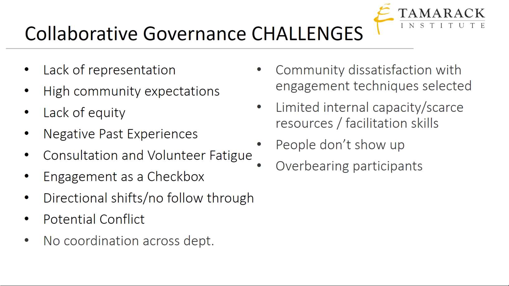 Do you have any examples of how your collaborative effort considered items in this list? Any do's or don't do's? Is there anything missing when working on a water governance project as complex and urgent as the Great Lakes?